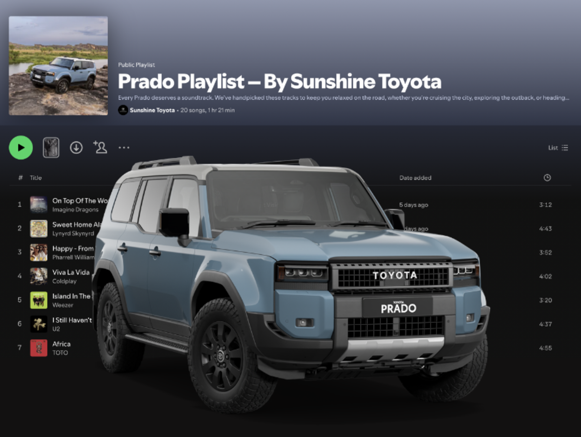 Every Toyota deserves the perfect soundtrack. We’ve curated Spotify playlists to match the personality of each model, from upbeat anthems for weekend adventures to smooth classics for everyday cruising. Find your Toyota model, hit play and enjoy the drive.