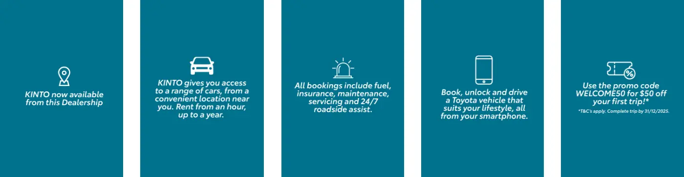 When you book a service with us, keep moving with ease using KINTO as an alternative to a courtesy car. Designed to give you ultimate flexibility, KINTO lets you book, unlock, and drive a premium Toyota straight from your smartphone. Whether you need a quick trip across town or an all-day rental, KINTO has you covered, giving you access to reliable, eco-friendly vehicles on your schedule. Simply download the KINTO app to book your ride from A to B while your car is in for service.