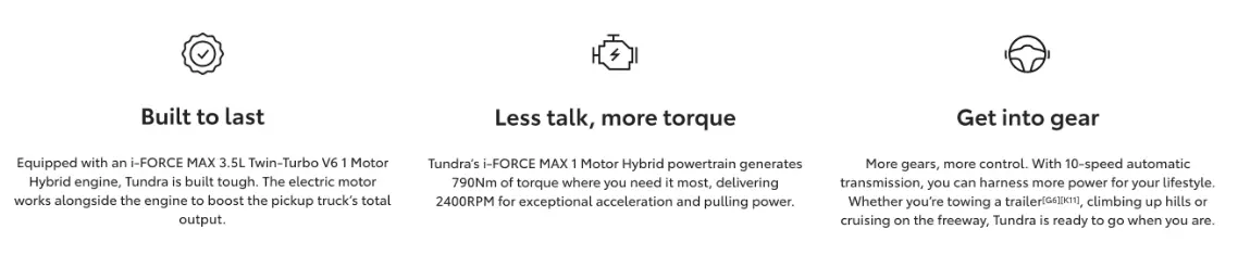 Designed with performance at its core, Tundra’s power, torque and engine ensure you have all the muscle you need.