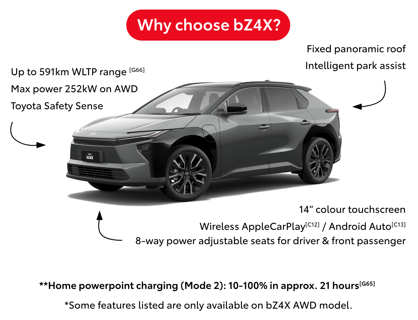 [G65]Charging times are indicative and may vary depending on environmental and charging conditions, type of charger and method used. Actual charging times may differ. Frequent use of DC Fast Charging can impact battery performance & durability. Toyota recommends minimising DC Fast Charging usage. DC fast charging speed will reduce after the battery is charged to 80%. Refer to Owner's manual and toyota.com.au/explore/electrified/charging-your-toyota for guidance.