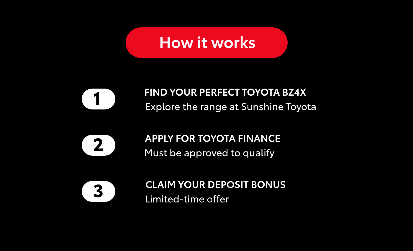 Deposit Bonus* for new and demo bZ4X (October 2025 build onwards) with Toyota Finance.
